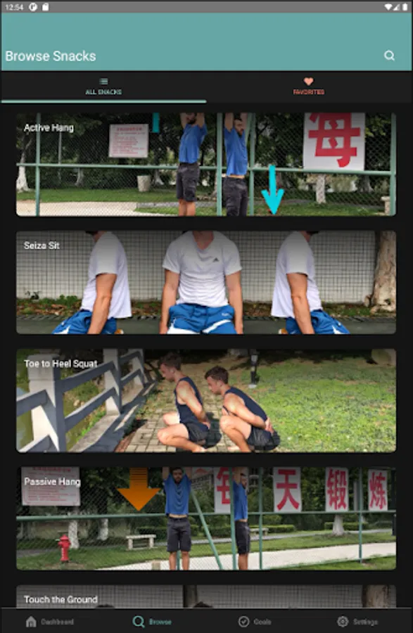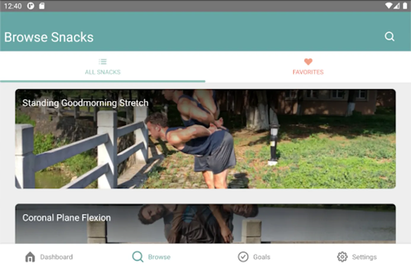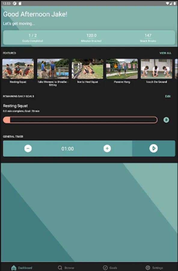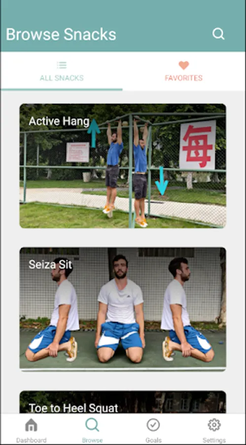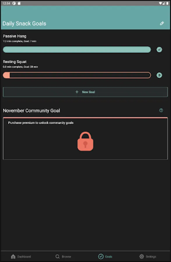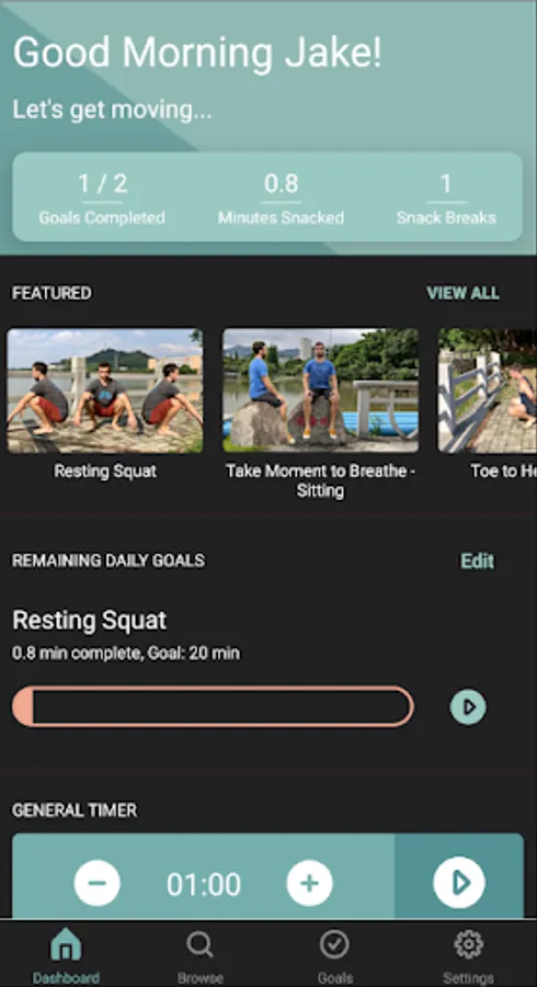 To develop a craving for movement users should utilize daily snack goals. Each goal will have a daily total and are tracked with a timer. The time is meant to be cumulative during the day, and not completed all at once. Aim to spend 30 seconds to a few minutes per snack per session. There are two default goals: the resting squat and the passive hang. Earn a sense of accomplishment by pushing the progress bar on the goals tab to completion!