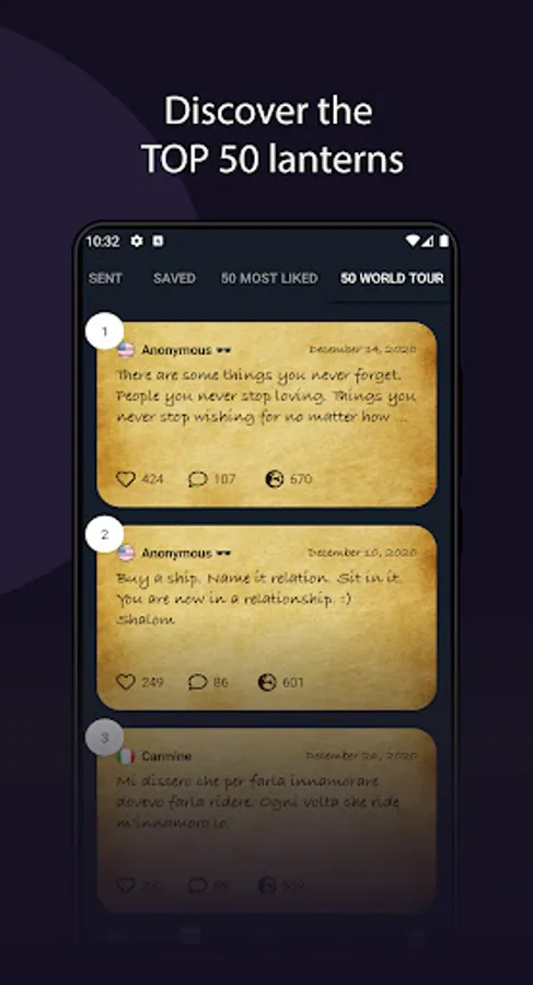 ๐ Capture the lanterns - Through a window on the world, you can capture and read thousands of lanterns that fly in the air. Discover the thoughts, secrets, emotions, and betrayals of other users.