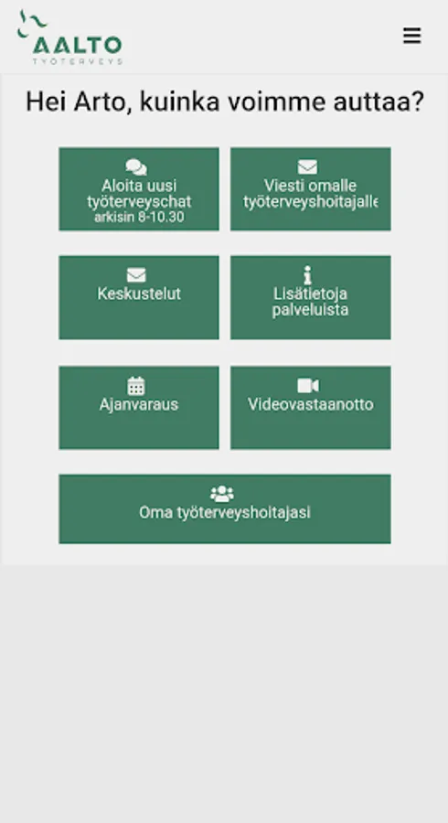 The electronic occupational health transaction channel is a fast, effortless and information-safe way to communicate with occupational health care. Through the application, you can get help from the on-call occupational health nurse, and in urgent matters you can contact your own occupational health nurse. You can set aside time for remote video reception, set aside time for reception, call, or research. More detailed instructions on using the OmaAalto service can be found on the Occupational Health Aalto website www.tyoterveysaalto.fi