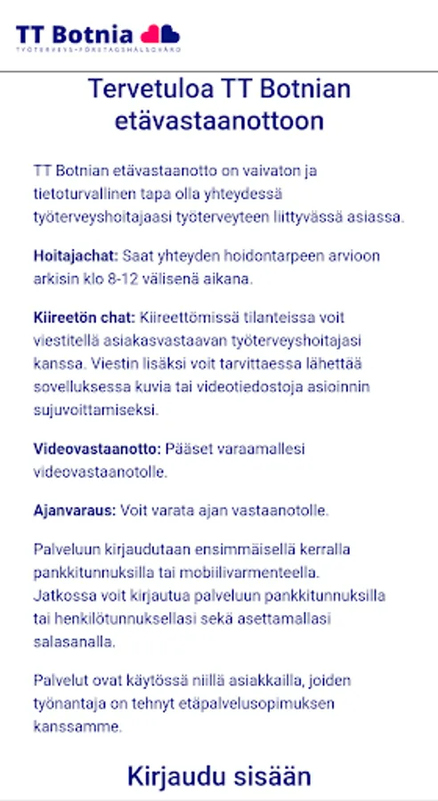 TT Botnia's electronic transaction channel for occupational health customers is an effortless and information-safe way to communicate with occupational health care. The application allows you to communicate either in urgent matters with a nurse or in non-urgent matters with your own occupational health nurse.