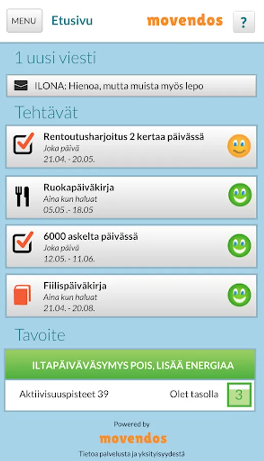 Movendos mCoach is an easy-to-use and secure remote coaching tool. It is an ideal solution for the health care, rehabilitation, wellness and career coaching professionals. It provides a vast library of coaching content for coaches in areas such as exercise, nutrition, sleep, stress management, time management, mental balance improvement and social relationships.