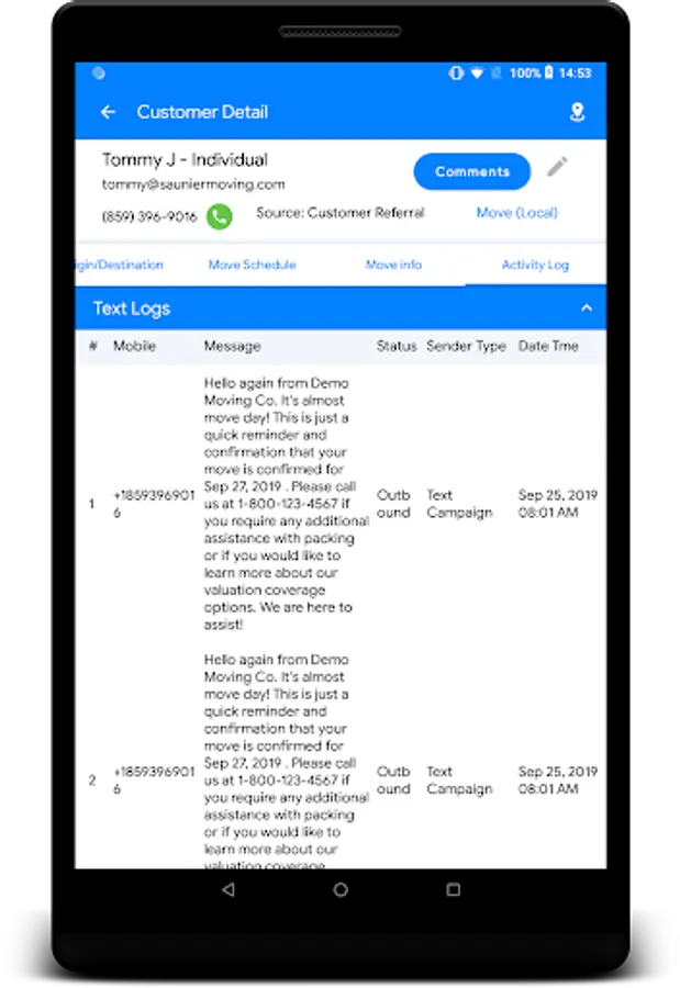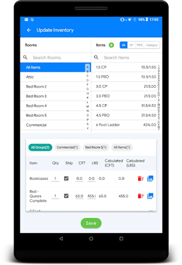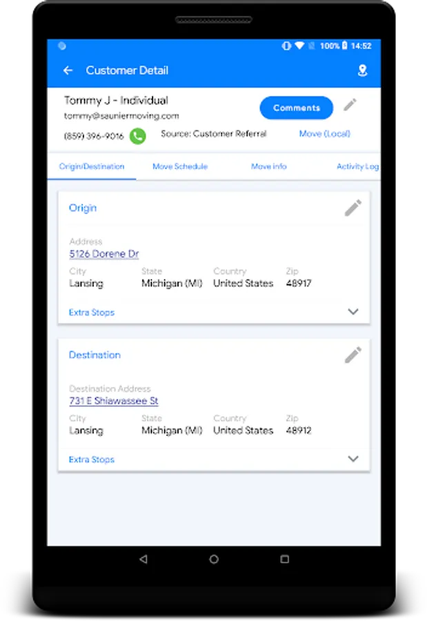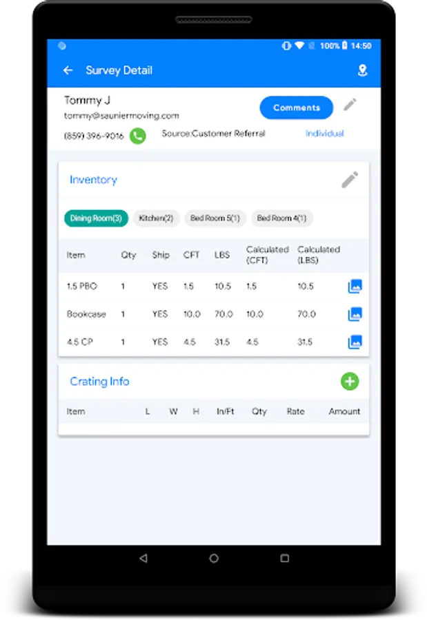 Comprehensive onsite estimating app with inventory, pictures, offline capability, powerful search, and a complete moving CRM on your tablet!