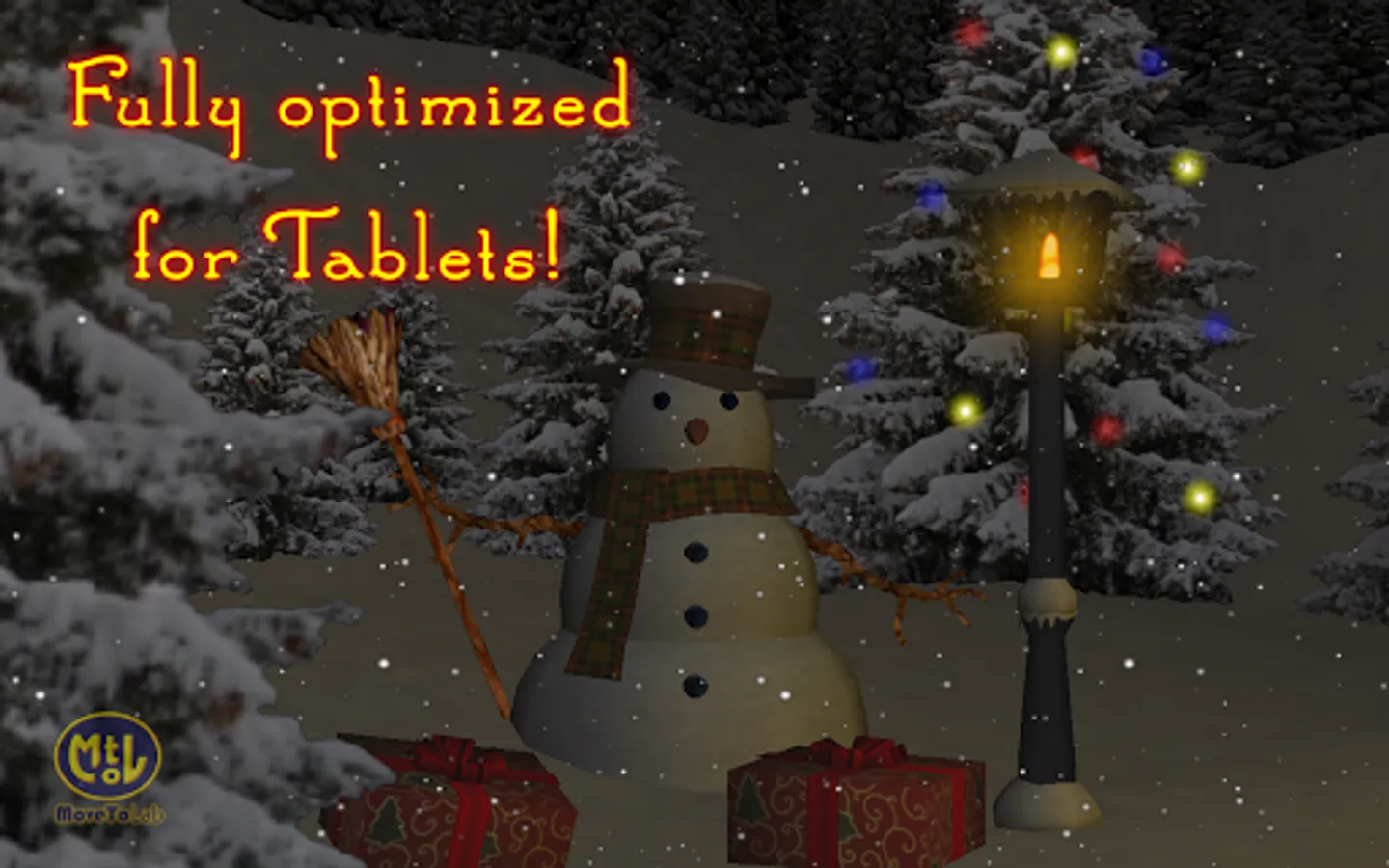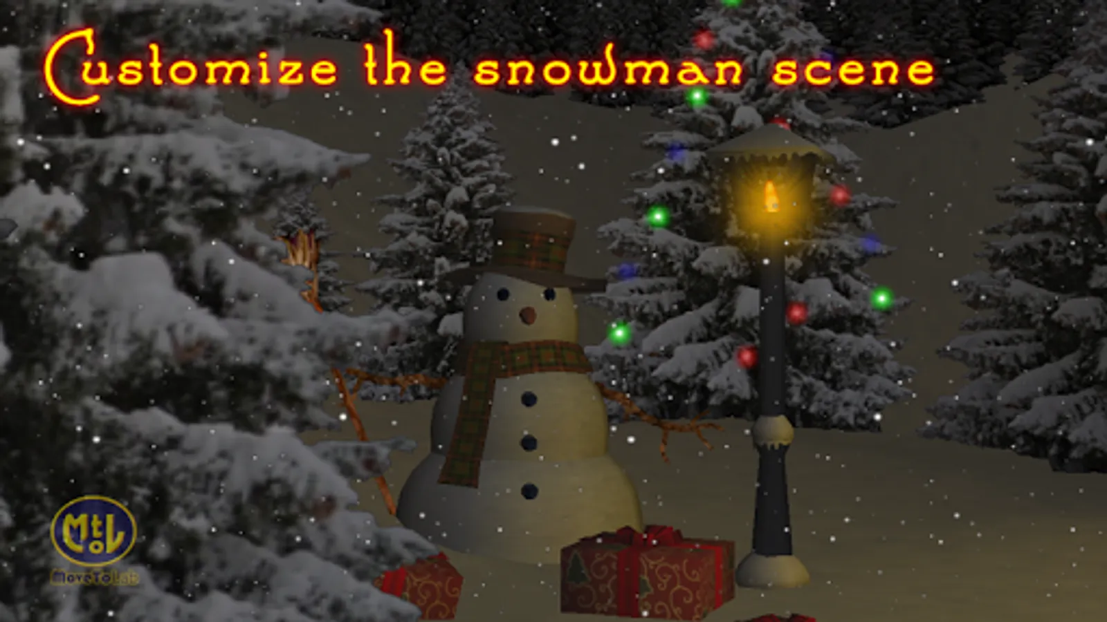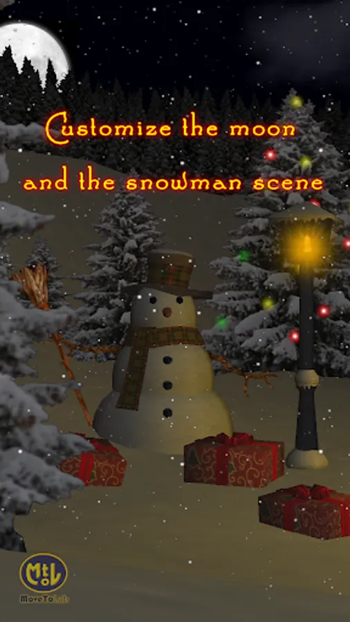 Take delight in viewing a nice snowman surrounded by plenty of Christmas gifts waiting to be opened, illuminated by the warm light of a streetlamp. You can customize the glow effect, the flickering flame and its brightness.