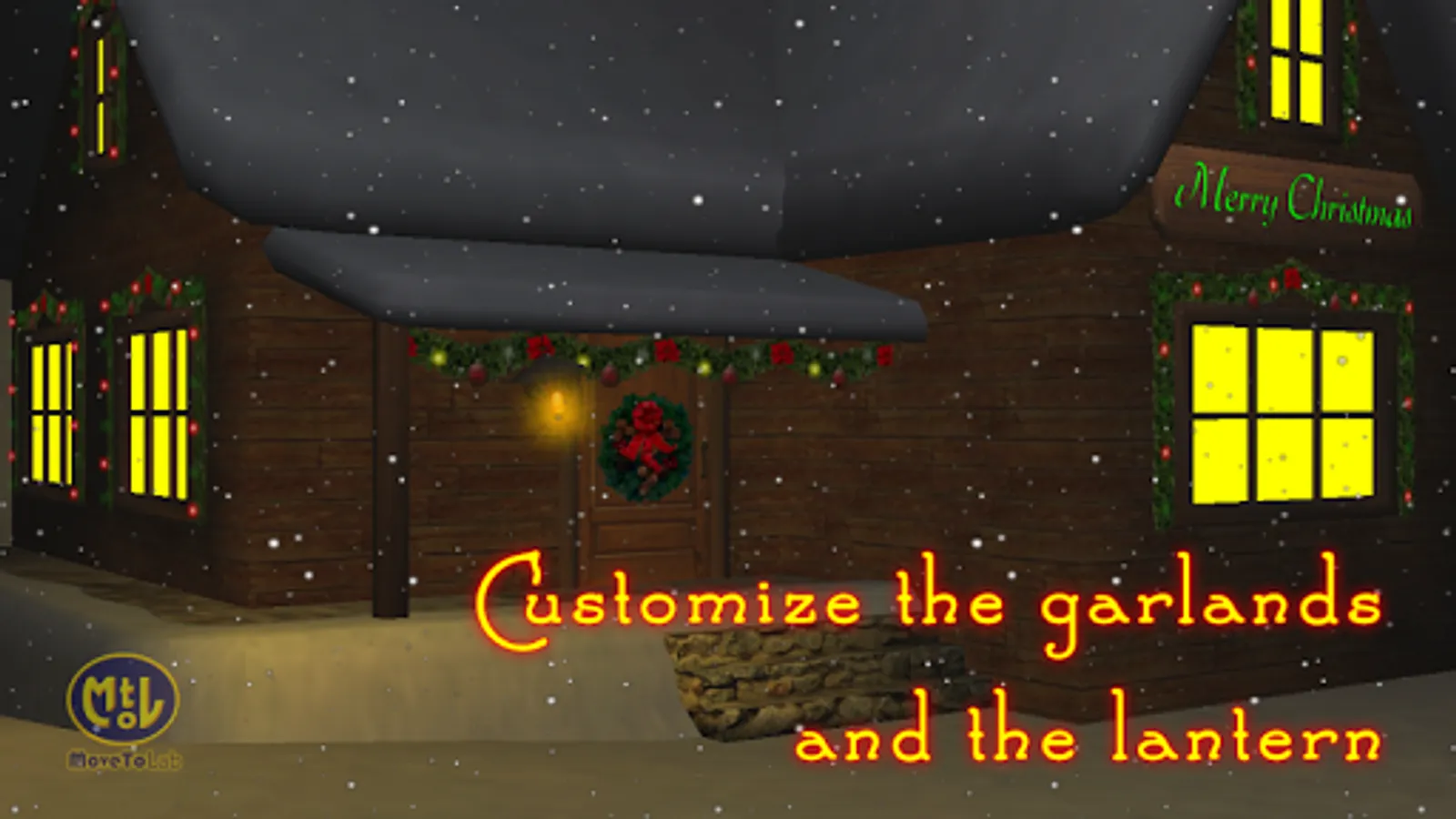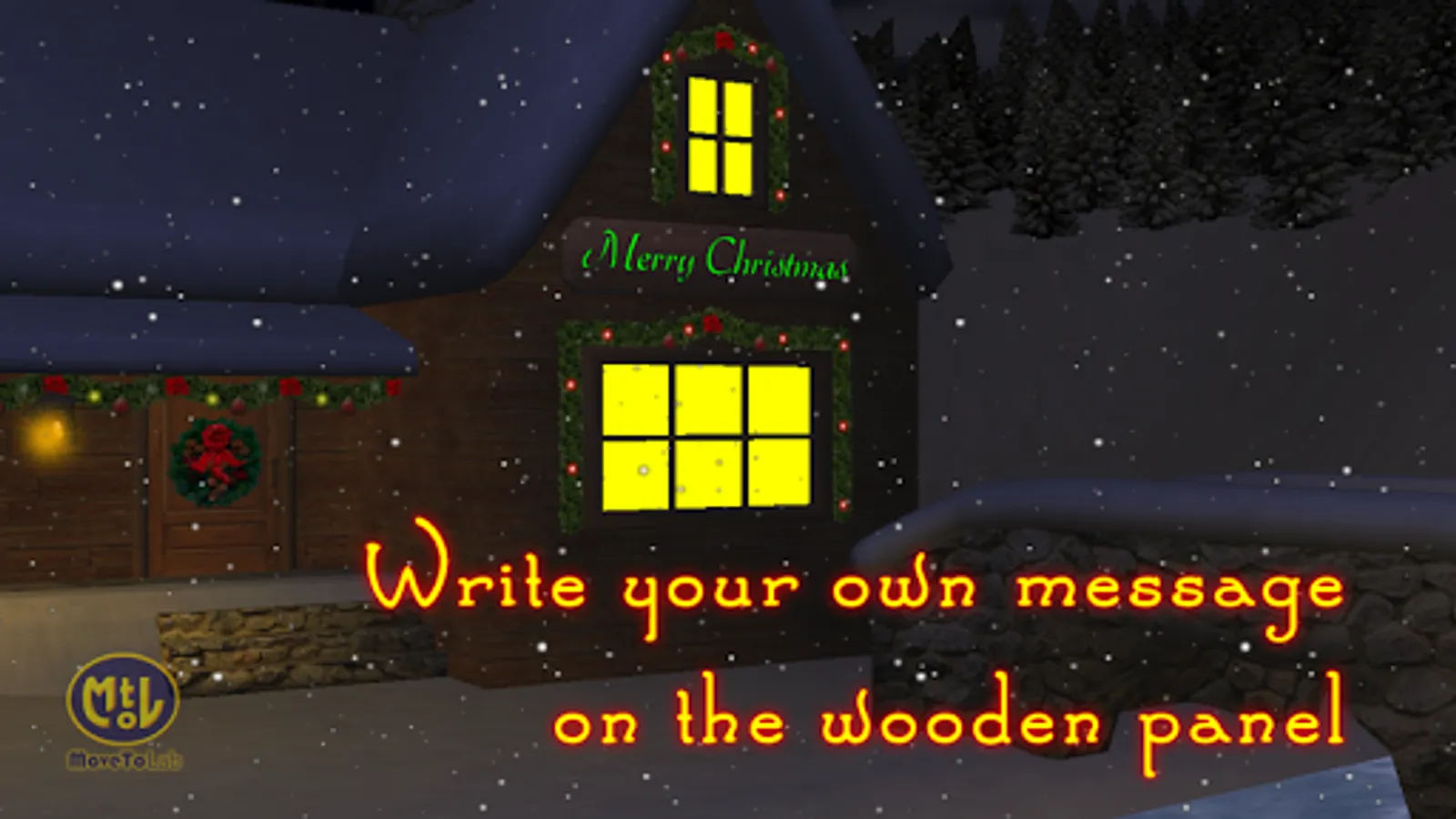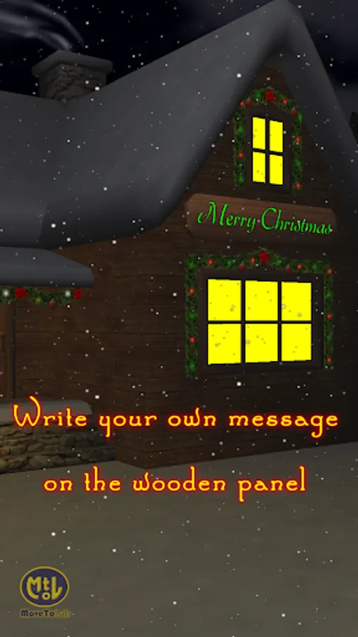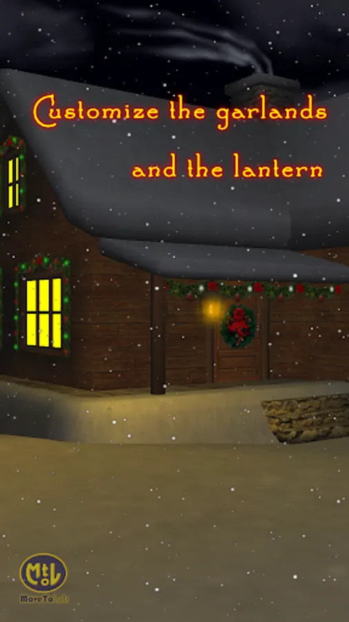 Customize your Christmas house by writing your own message for Santa Claus or for yourself on the wooden panel. Enjoy the smoke of a warm fireplace vanishing in the cloudy night sky. Continue your travel along the snowy path and admire a romantic and snowy bridge lit by a streetlamp under which an icy blue river gently flows.