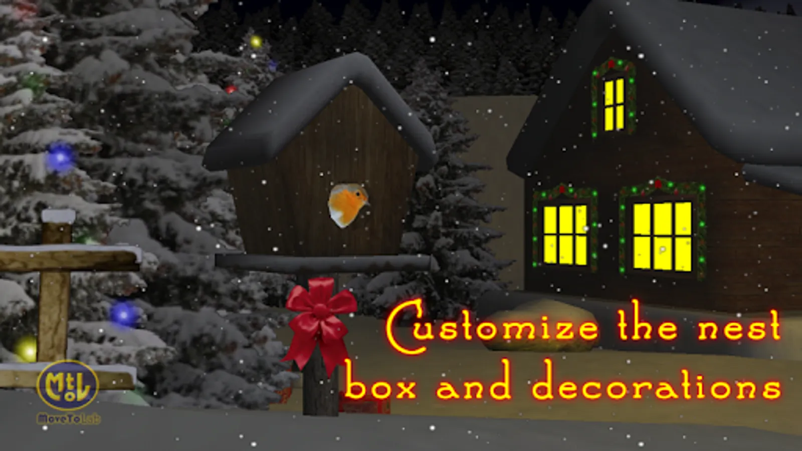 While moving the camera, by sliding the homescreens, you will discover a beautifull snowy landscape. Go through the path and look at the nest box where you may see a little redbreast randomly appearing.