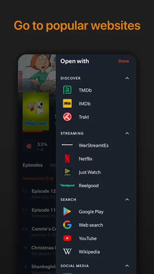 • Open a movie, TV show, season or episode with IMDB, Trakt and TMDB