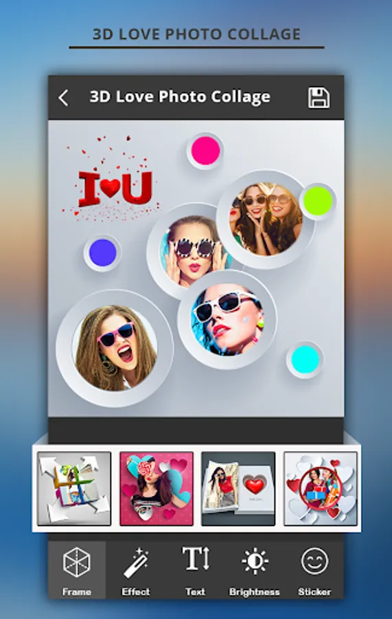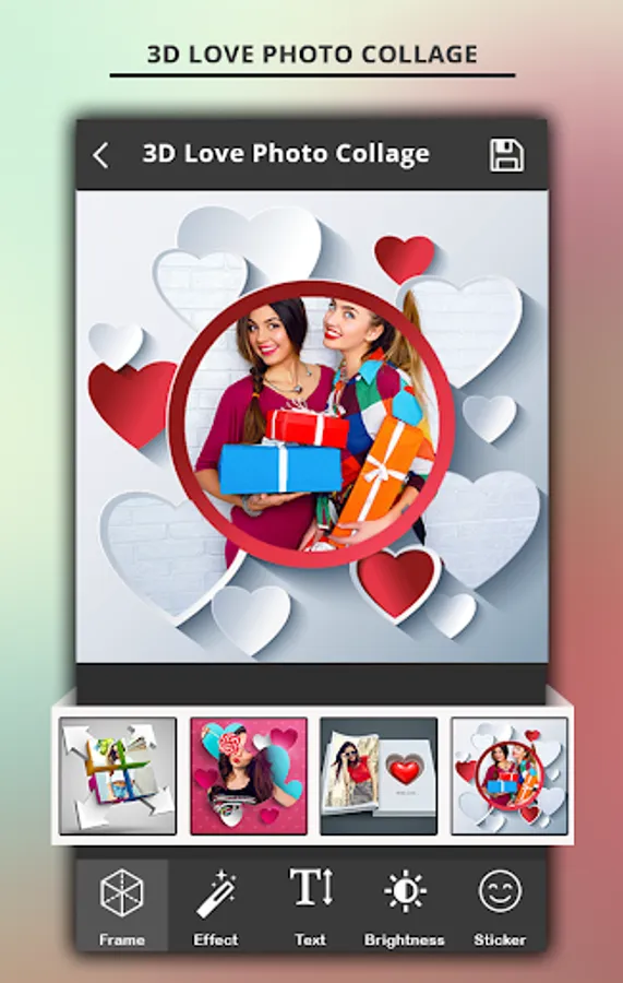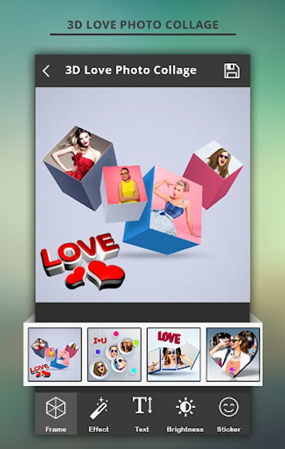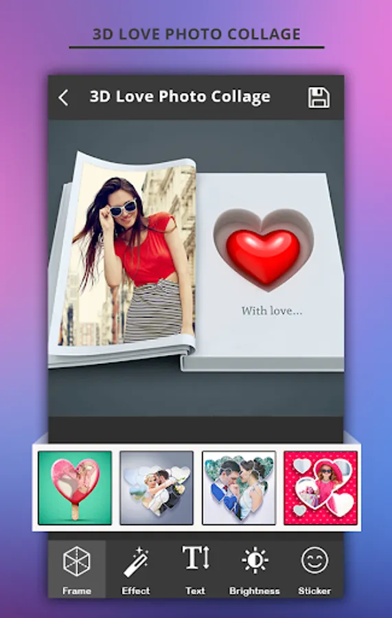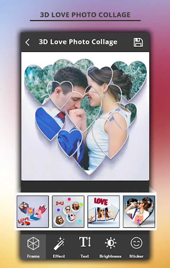 3D Love Photo Collage Maker you can combine ordinary photos into fabulous & amazing photo collages. Give a real 3D look to your photo by using our 3D Special effects photo editor app.