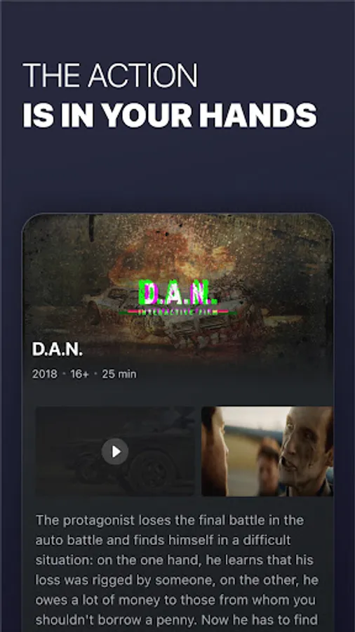 The first online cinema for interactive movies. You can be part of the action, control development of the story and immerse yourself into the cinematic world. Engaging interactive mechanics and breathtaking plot twists. Actions of the characters depend on your choice. It’s not just watching a movie anymore, it’s interaction. Watch. Play. Make your choice. Repeat.