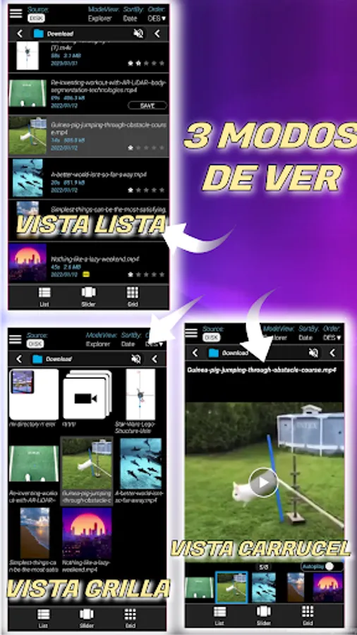 ►Tres modos de ver tu lista de videos: en lista, en mosaicos y en carrusel.