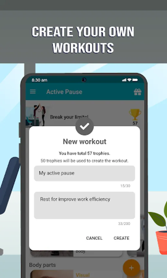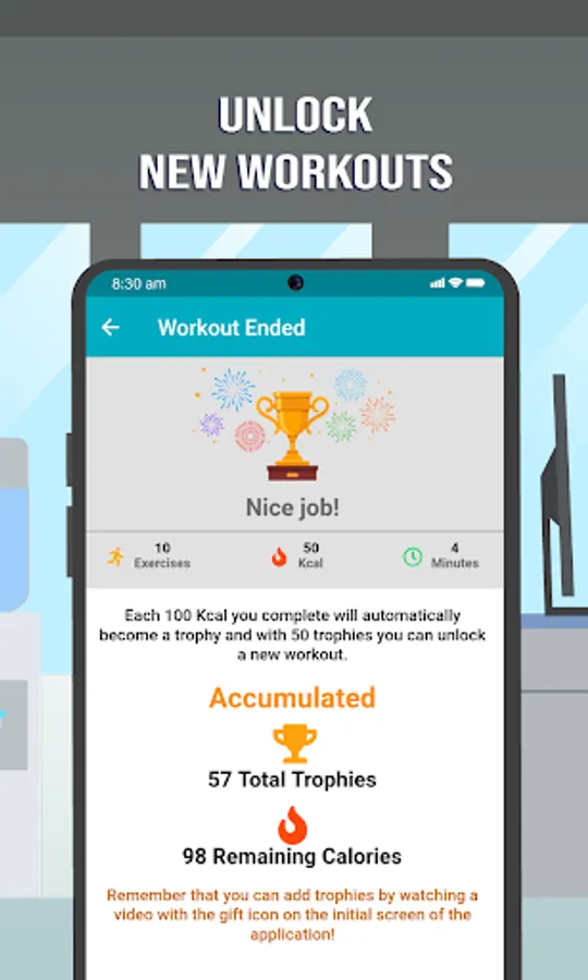 All workouts are made by professionals and you can do them in the comfort of your home. You start your training with 200 trophies, and you can earn more burning calories. Trophies helps you to unlock more workouts.