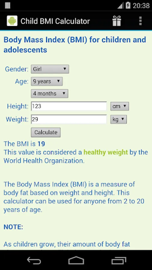 The BMI is a measure of body fat based on weight and height. Our medical utility application can be used for kids and adolescents from 2 to 20 years of age. BMI Calculator helps you to find the ideal weight.