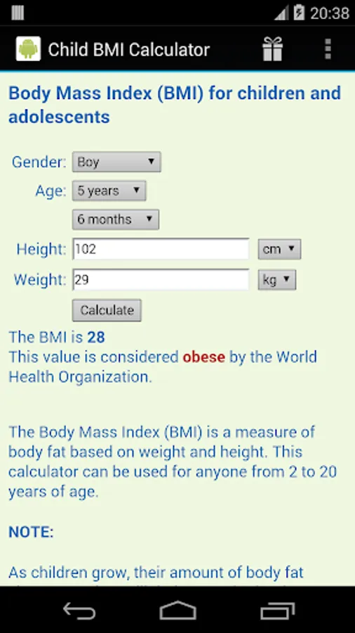 Please note that as children grow, their amount of body fat changes and so will their BMI. That's why a Body Mass Index( BMI) calculation for a child or adolescent must take into account their age and gender. Always see your doctor if you are concerned about your child's growth.