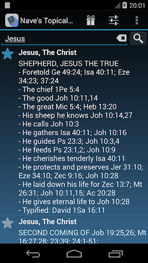Explore over 20,000 topics and subtopics of the Holy Bible. With over 100.000 references to the Scriptures, Nave's Topical Bible will guide your understanding of the word of God and His son Jesus Christ. A must have reference app for any serious study of the Old and the New Testament.