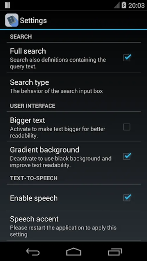 * Listen to the definitions using Android's built-in Text-to-speech synthesizer with American or British accent.