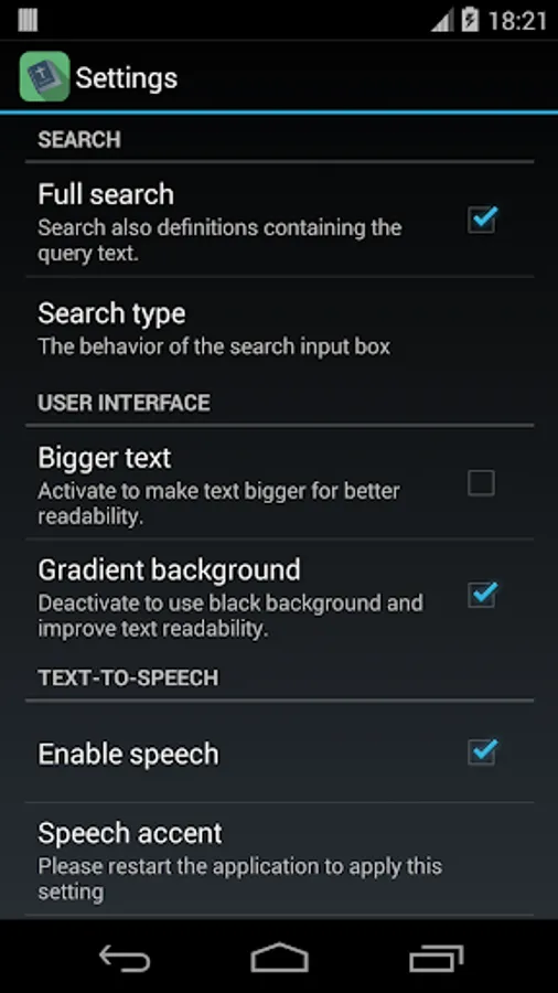 * Listen to the definitions using Android's built-in Text-to-speech synthesizer with American or British accent.