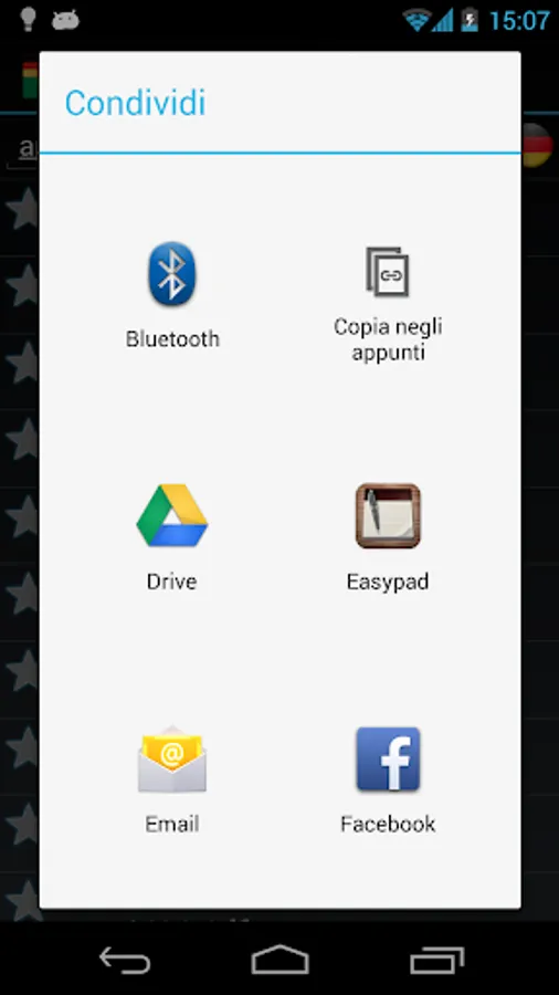 A: Just press 2-3 seconds over the translation and you will be presented with a menu with all available sharing options based on the apps installed in your device (Email, SMS, etc)