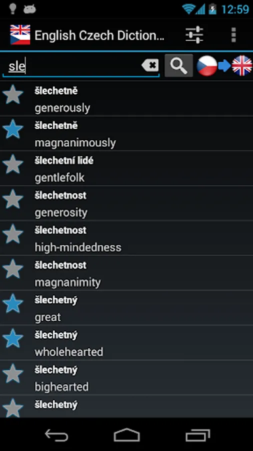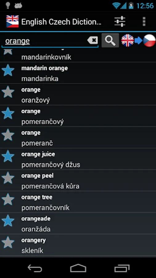 * Listen to the correct pronunciation in British or American English and Czech (if installed) using Android's built-in Text-to-speech synthesizer.