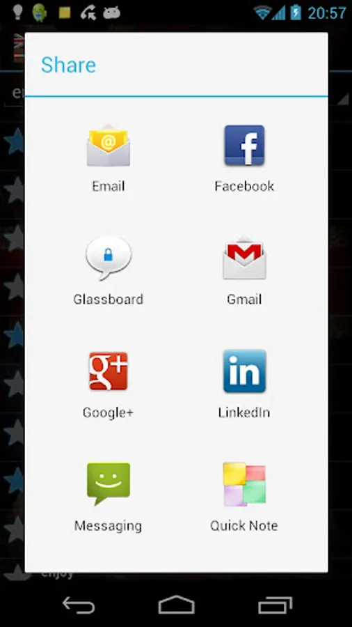 A: Just press 2-3 seconds over the translation and you will be presented with a menu with all available sharing options based on the apps installed in your device (Email, SMS, etc)