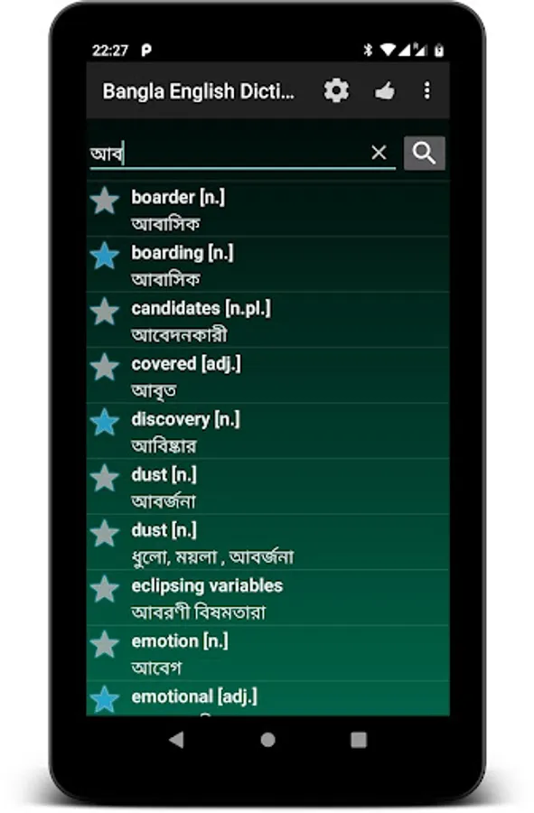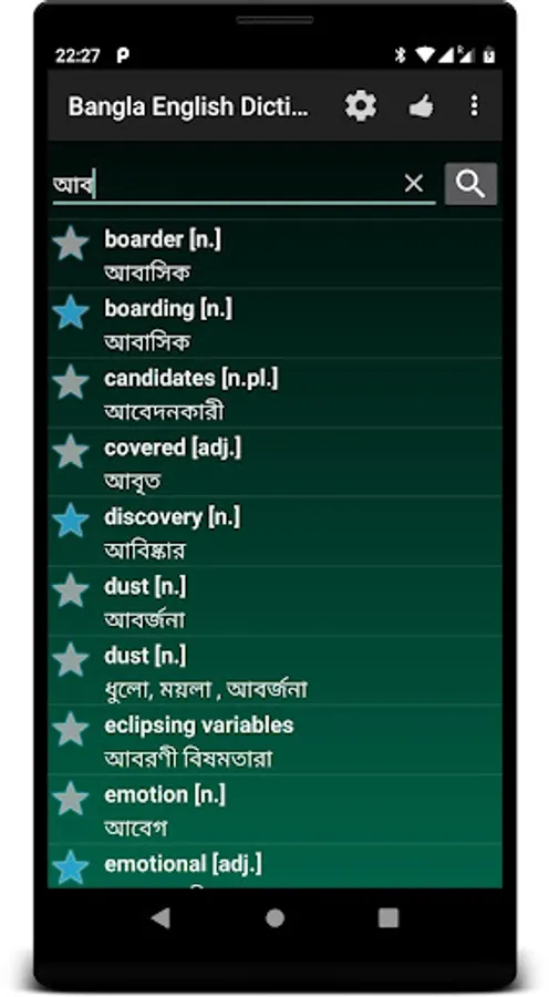 * Comprehensive bilingual dictionary (অভিধান) with thousands of English-Bangla (ইংরেজি বাংলা) translations. Helps you improve English/Bangla language vocabulary!