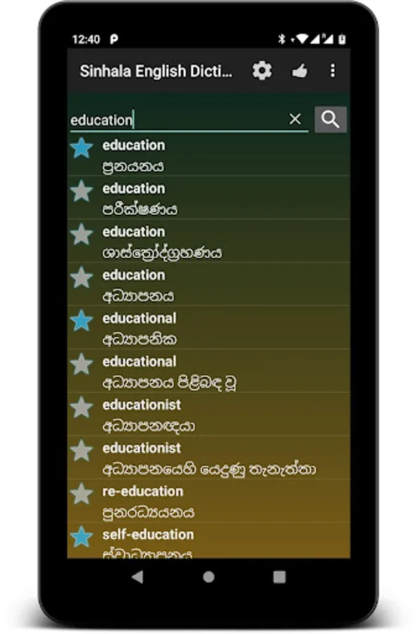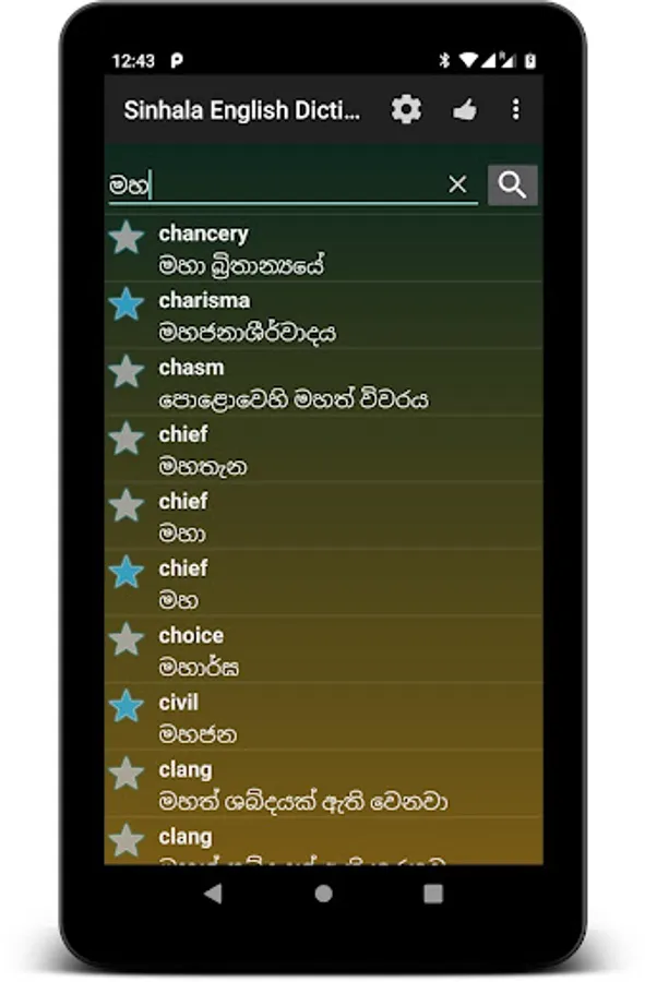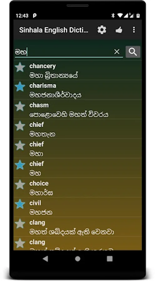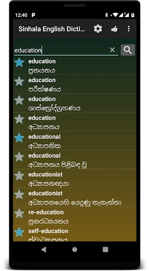* Comprehensive bilingual dictionary with thousands of English-Sinhala translations. Helps you improve English/Sinhala language vocabulary!