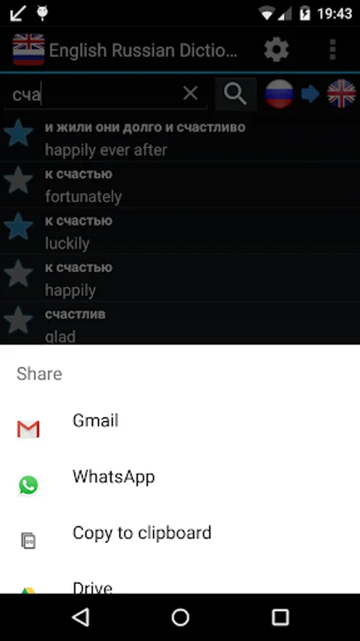 A: Just press 2-3 seconds over the translation and you will be presented with a menu with all available sharing options based on the apps installed in your device (Email, SMS, etc)