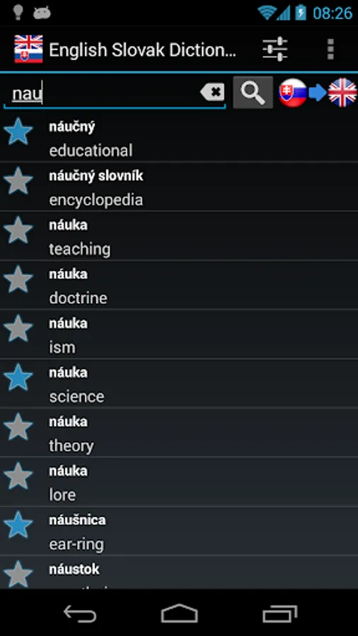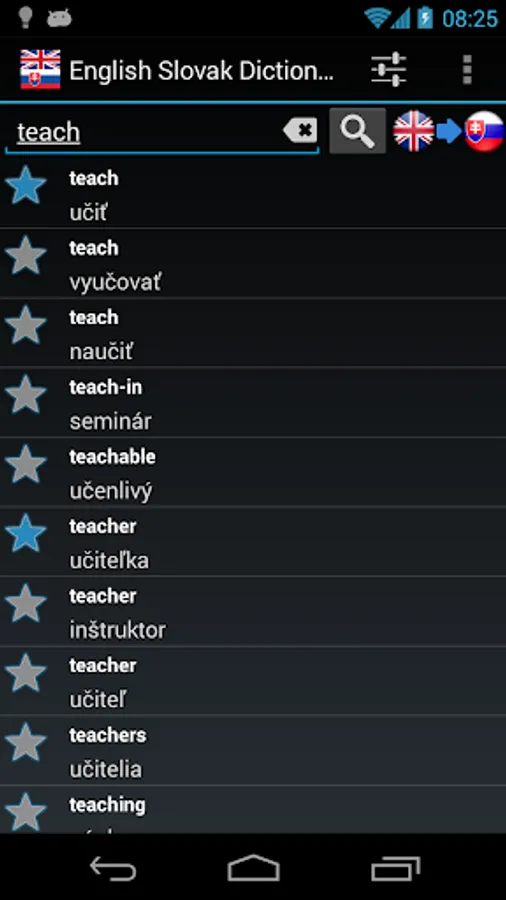 * Listen to the correct pronunciation in British or American English and Slovak (if installed) using Android's built-in Text-to-speech synthesizer