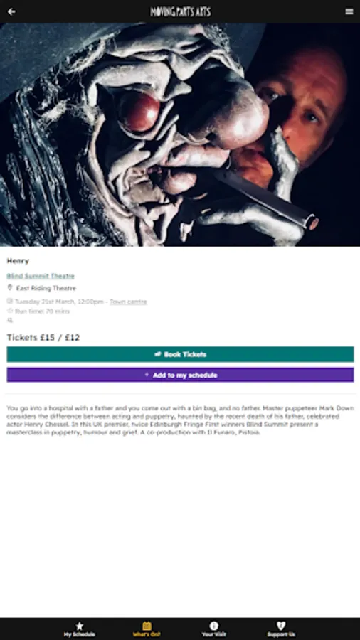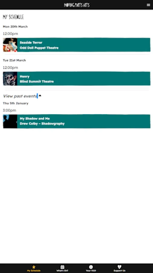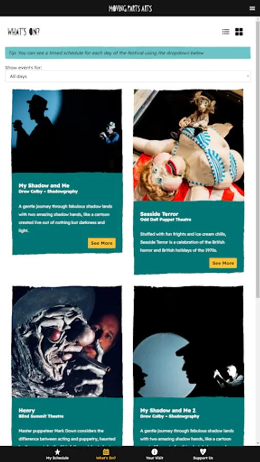 Companion app for the Newcastle Puppetry Festival, hosted by Moving Parts Arts. Create and manage your own schedule, and get festival info & updates