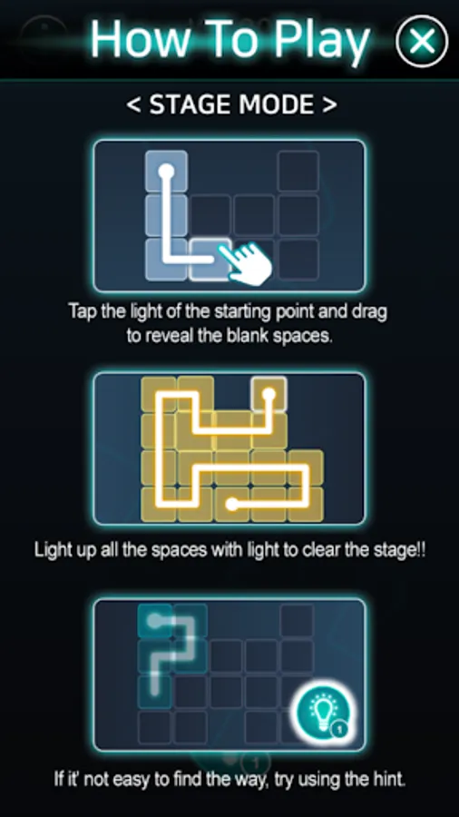 LightLine is a puzzle game in the form of a single-painting. Move the light at the starting point and fill all the blanks with light to clear the stage.