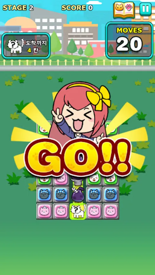 Solve the three-match puzzle, remove the obstruction block, and take the main character to the cat