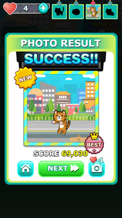 It is a three-match puzzle game in which the main character who loves cats goes on an adventure to take pictures of cats.