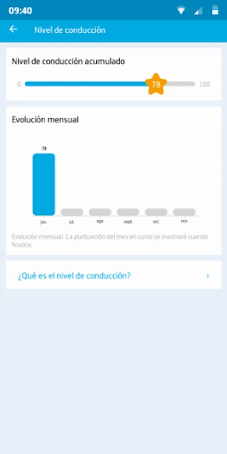 - Driving level: Contributes to road safety and can serve as a guide for the driver to improve their driving habits. The user will see a cumulative score from 1 to 100 that is calculated based on an algorithm that deals with variables related to driving.