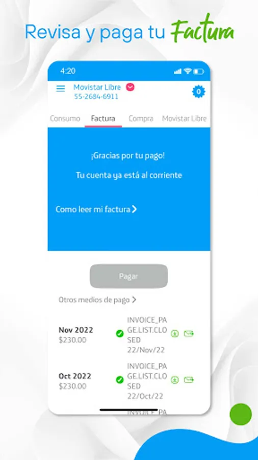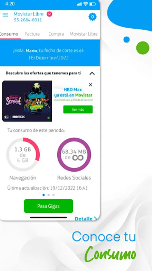 With the Movistar MX App, you have all the information about your Plan or Prepaid at your fingertips. With it you can pay your bills, recharge with credit and debit cards, check your balance, know the details of your consumption, buy packages and more.