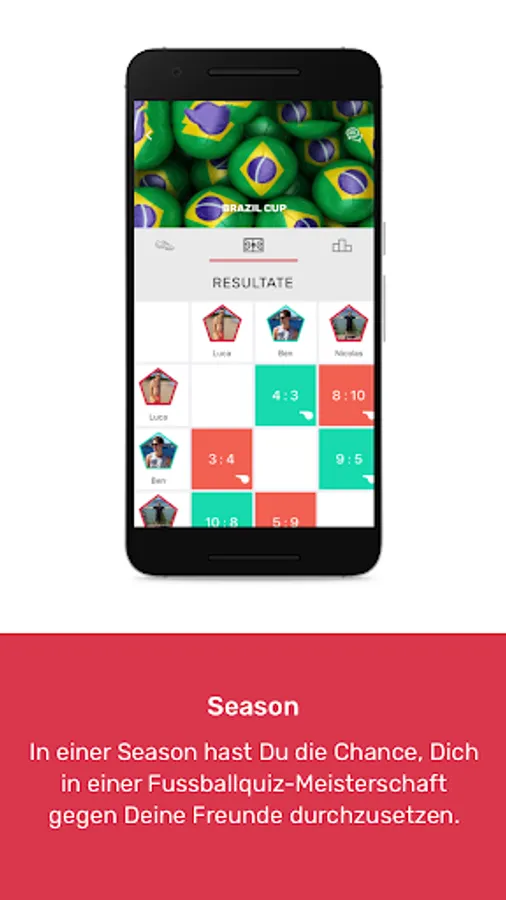 - Season: In einer Season hast Du die Chance, Dich in einer Fussballquiz-Meisterschaft gegen Deine Freunde durchzusetzen