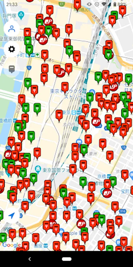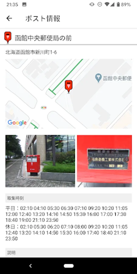 It is an application of postmap (postmap.org). The post map was established in 2006, and post boxes nationwide are mapped and updated daily by users' posts. In the app, the location of the mailbox (red), convenience post (green), and post office (JP) is displayed. Tap the marker to see detailed information such as photos and collection time.