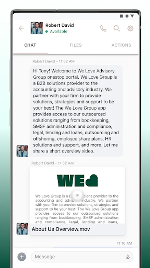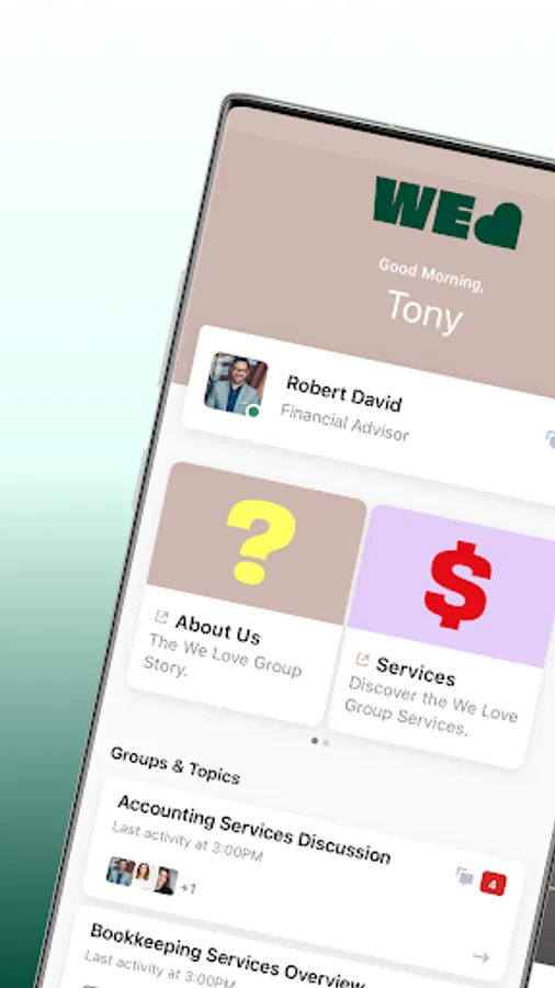 The We Love Group app provides access to our outsourced solutions ranging from bookkeeping, SMSF administration and compliance, legal, lending and loans, outsourcing and offshoring, employee share plans, HR solutions and support, and more. With interactive features like secure messaging, document sharing, e-signature, task management, calendaring, file annotation, and video meetings, our app enables a streamlined solutions provider experience from the convenience of your phone.