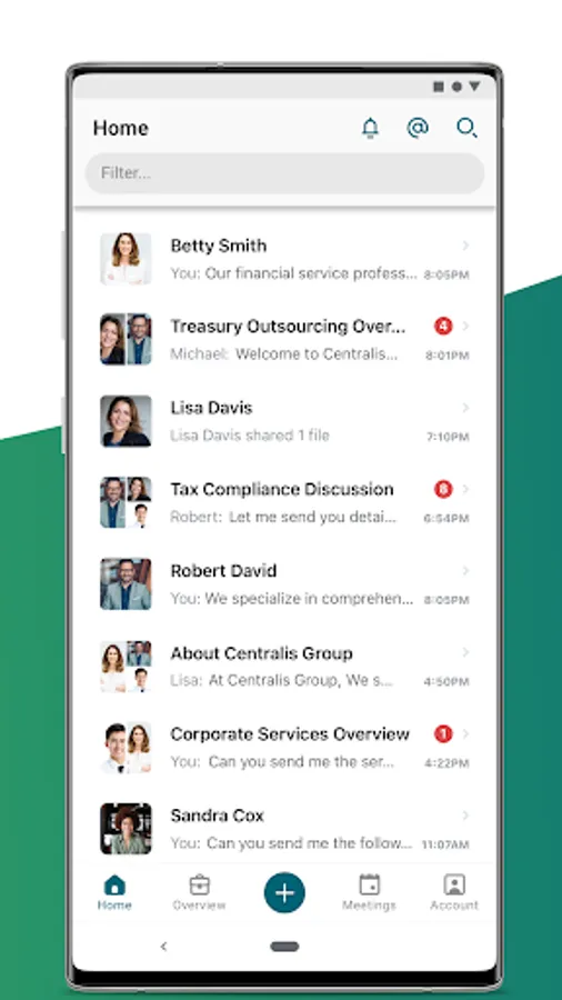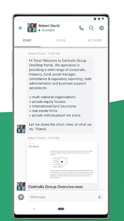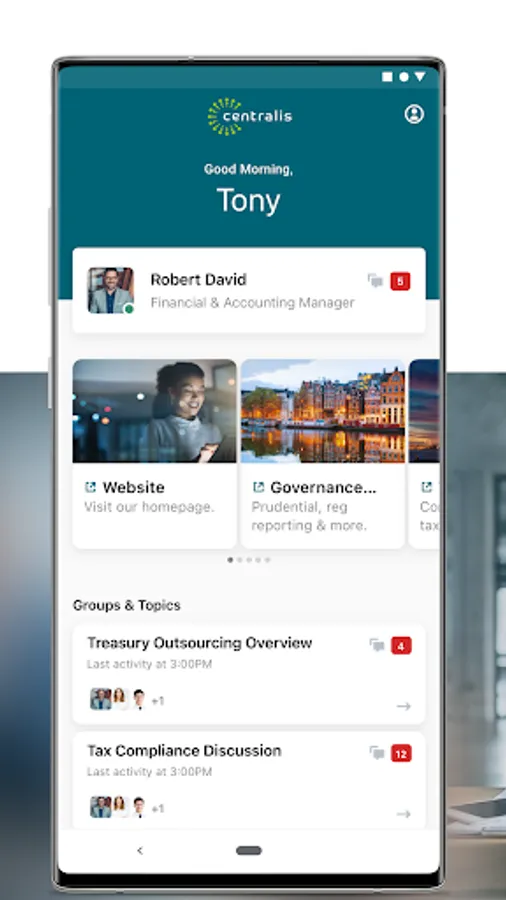 The Centralis app gives you the freedom to focus on your core strengths and business strategy. Use our app to interact with our team via secure messaging, share files, attend video meetings, sign documents, and more.