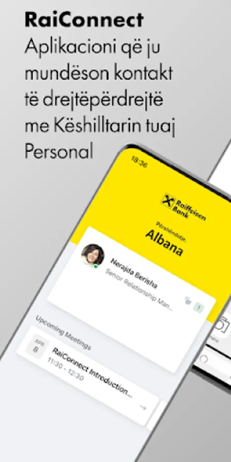 RaiConnect by Raiffeisen Bank Albania the new way for you to connect and communicate with your dedicated Relationship Manager at a time and place that is convenient to you. This app is the place where from today on you can talk to your bank, exchange documents, make audio or video calls and share screens. You can also at any time go back to the past conversation and exchanged documents.