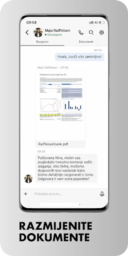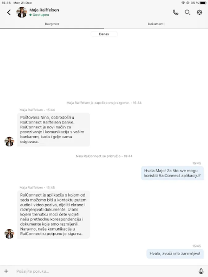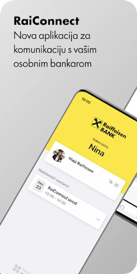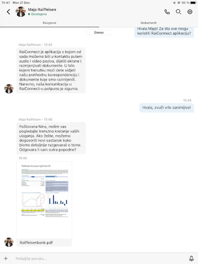 The RaiConnect application allows you to connect and communicate with your banker from any location you are in. With RaiConnect you can connect with audio and video calling, share screens and documents in a secure way. The application keeps all previous correspondence and documents that you have exchanged with your banker, so you can always access them. RaiConnect is currently available for Premium clients and small business representatives.