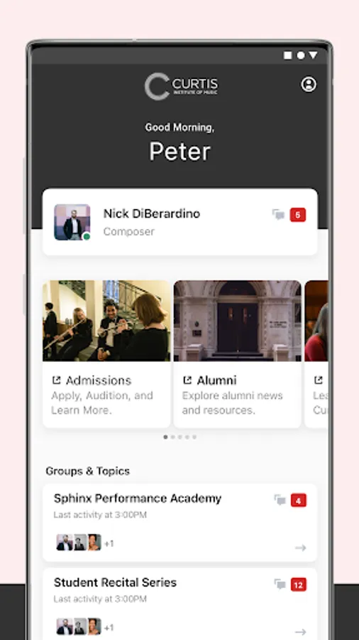 CurtisConnect allows prospective students to connect with alumni, faculty, and students to learn more about Curtis and work closely with Curtis mentors for artistic development. CurtisConnect also enables Curtis alumni to connect with mentors, prospective students, and fellow alumni for professional and career development.
