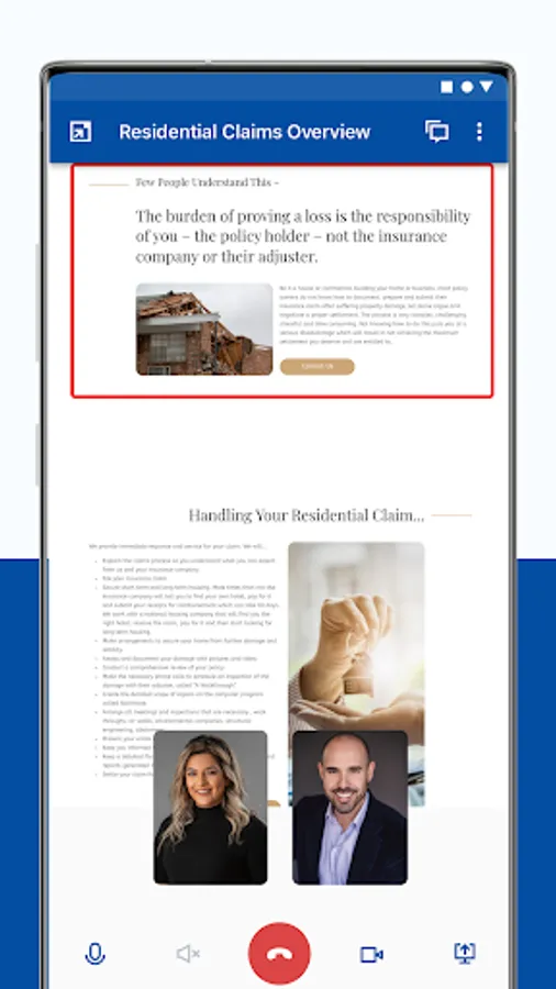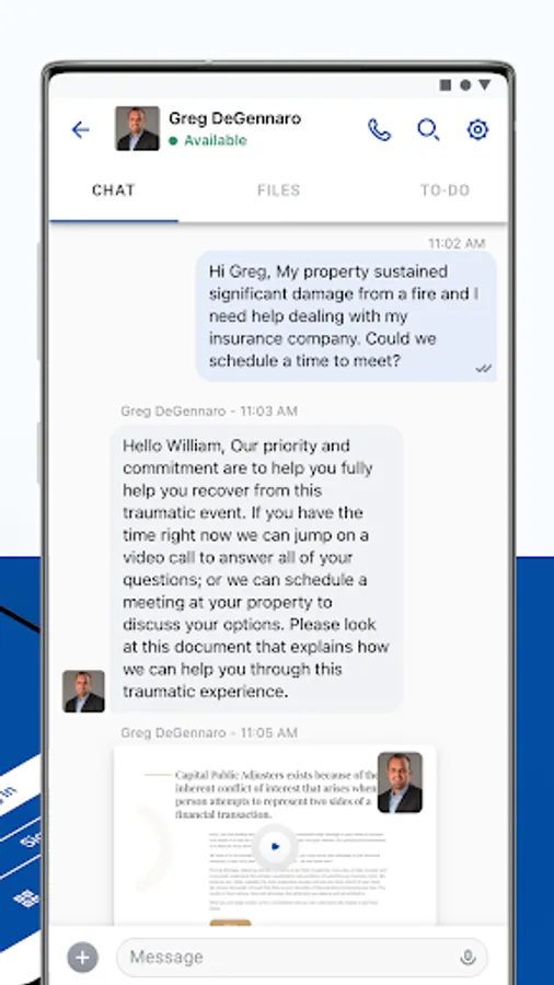 At My Capital PA, proving damages, adjusting, and settling claims is our field of expertise. Use 4CPA to securely communicate with our team via text, voice, and video messaging throughout the entire insurance claims process. In-app collaboration capabilities include task and calendar management, easy transactions, video conferencing, digital signature, and more.