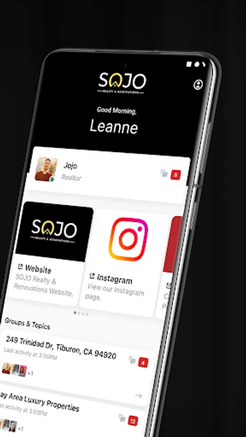 Use SOJO Realty & Renovations to connect with us via secure text, voice, and video messaging, view current listings, e-sign documents, complete voice & video calls, share files, create tasks, complete virtual walkthroughs, and more.