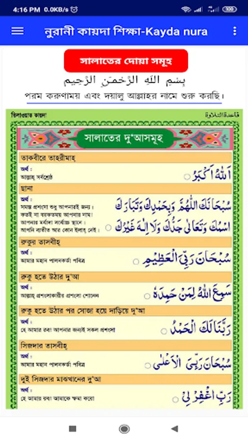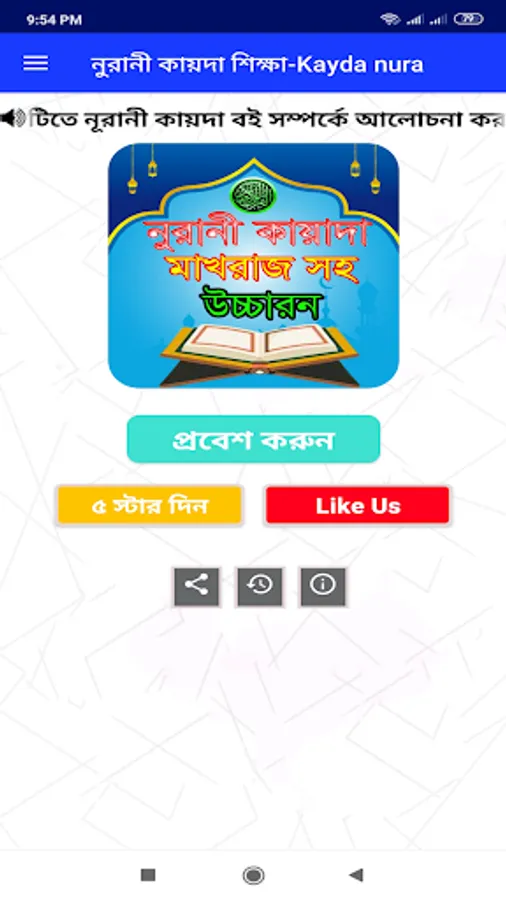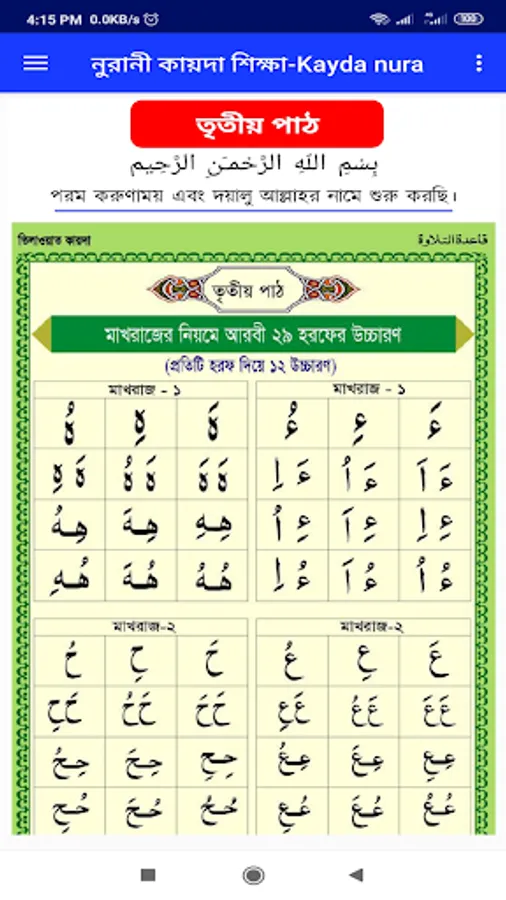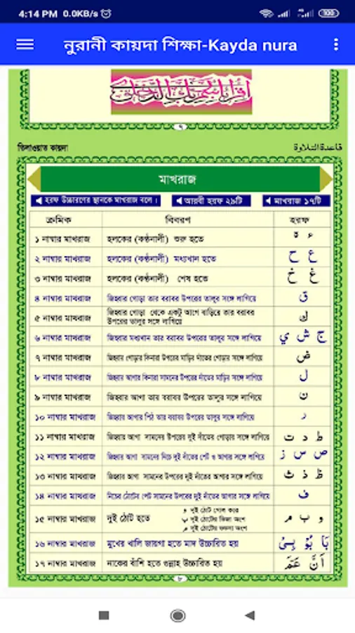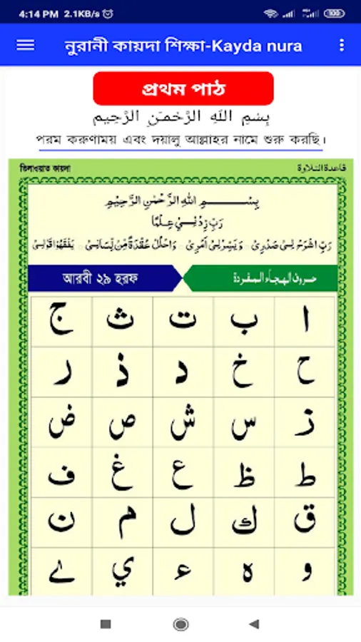 The 'Noorani method' is actually an improved method in teaching the Quran as a means of purely reciting the Quran in a short period of time. I have personally witnessed the benefits of this method. With the benefit of this method, children will be able to absorb the pure recitation of the Qur'an Sharif along with the essential issues and supplications in just one year. Nadiatul Quran Noorani qaida is a popular book for learning Arabic and learning Quran. Now brought in app form. Here the sceneries suitable for reading both day and night have been constructed. Nice looking and easy to use.