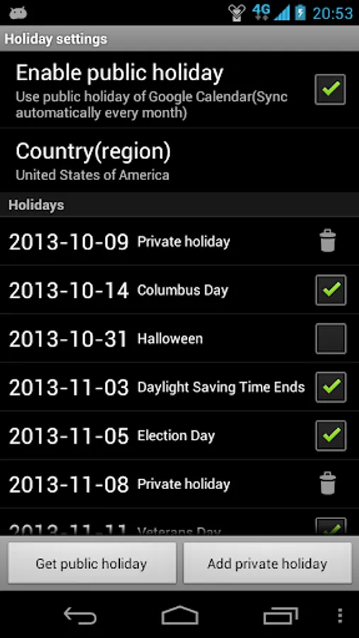 Using "Google Calendar API"(Internet connection required), support public holidays of multiple countries(regions). it is possible to register personal holiday also. Repeat time signal be disabled or enabled on public(private) holidays.