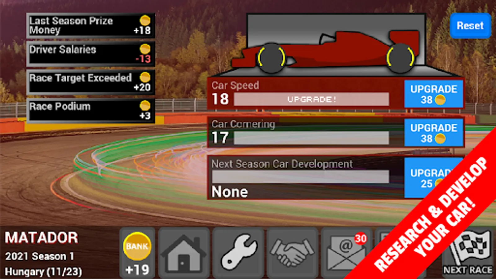 * Manage your accounts, upgrade your car, invest in Research and Development