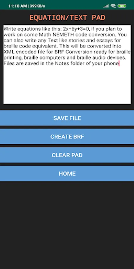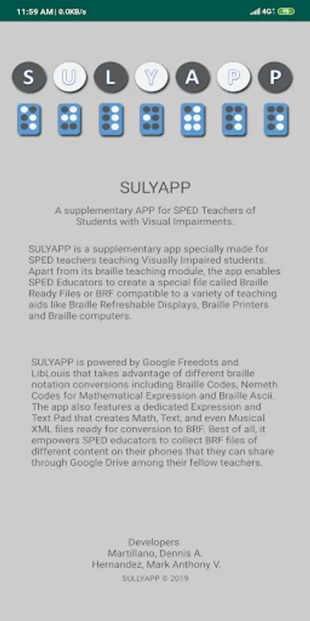 SULYAPP is powered by Google Freedots and LibLouis that takes advantage of different braille notation conversions including Braille Codes, Nemeth Codes for Mathematical Expression and Braille Ascii. The app also features a dedicated Expression and Text Pad that creates Math, Text, and even Musical XML files ready for conversion to BRF. Best of all, it empowers SPED educators to collect BRF files of different content on their phones that they can share through Google Drive among their fellow teachers.