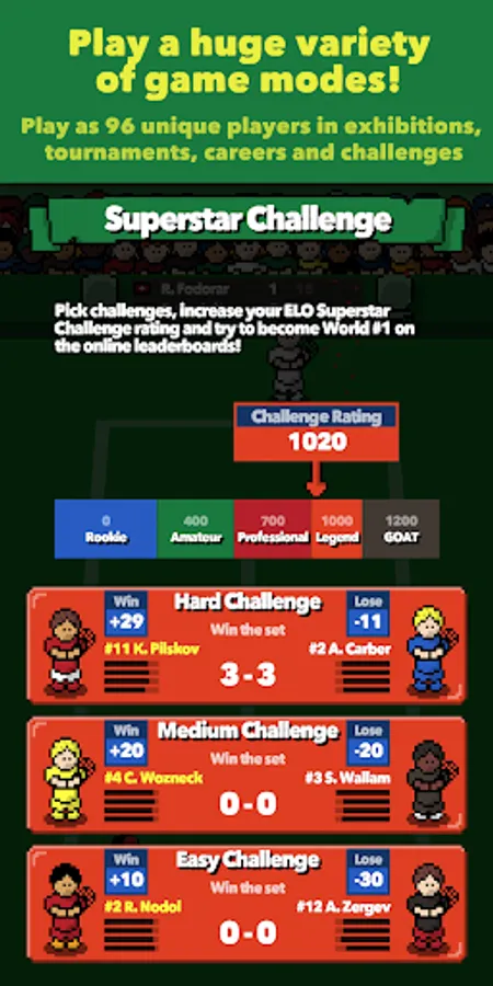 Or play as or against 96 computer players with unique playing styles, or create your own player in Career mode and work your way up to the #1 in the world.