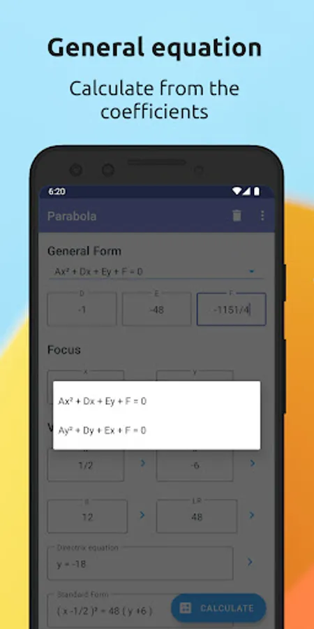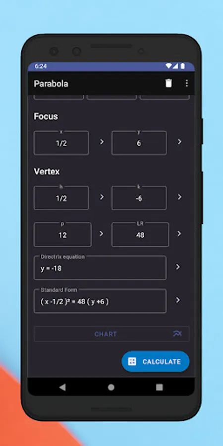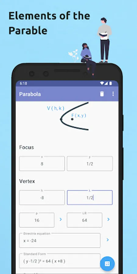 Enter the coordinates of the Vertex ( h, k ) and Focus to get: