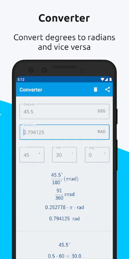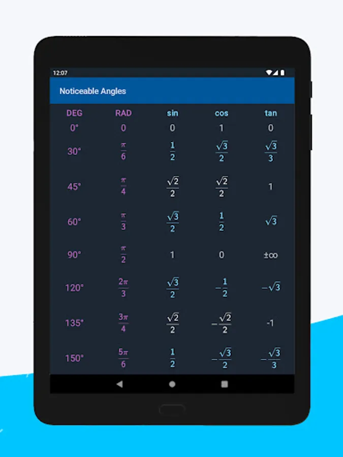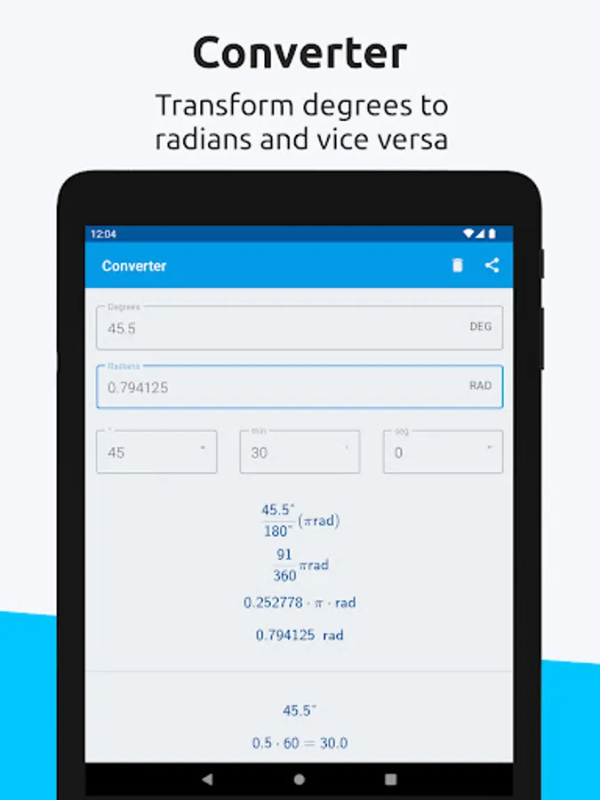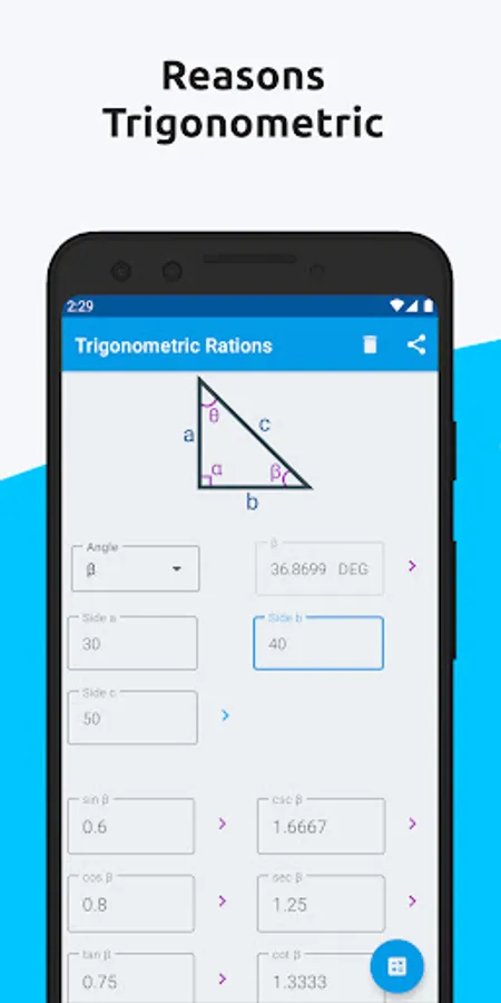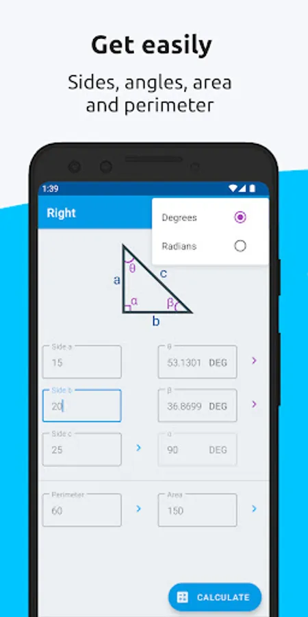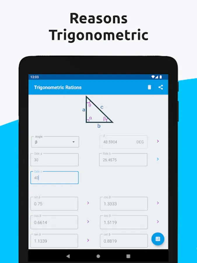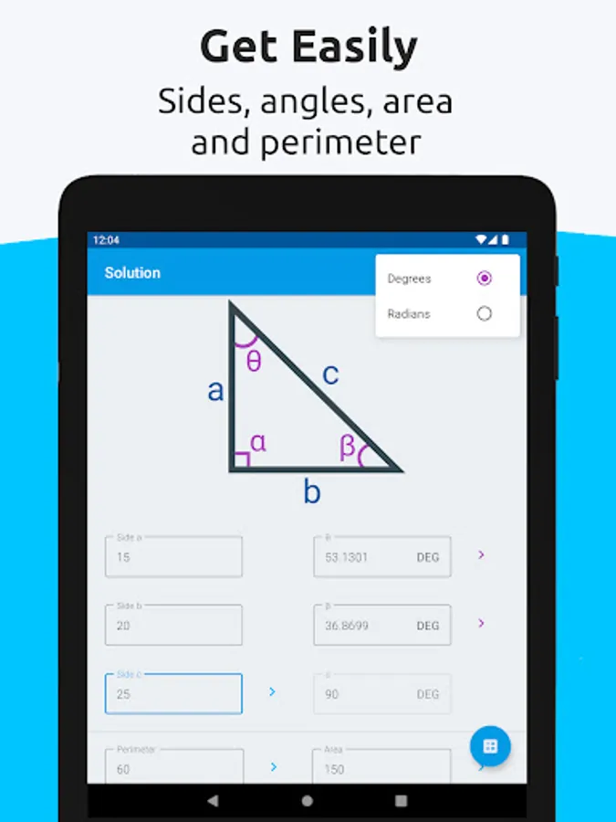 🖋️ Our Trigonometry app is the tool you need in your professional life. Get the value of the trigonometric functions, convert angles in degrees to radians or vice versa, and calculate any side, angle, area or perimeter of triangles in a practical and accurate way.