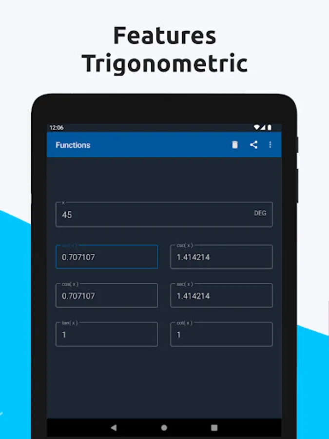 • Easily calculate the value of the Trigonometric Functions (Sine, Cosine, Tangent, Cosecant, Secant, Cotangent) in degrees and radians.
