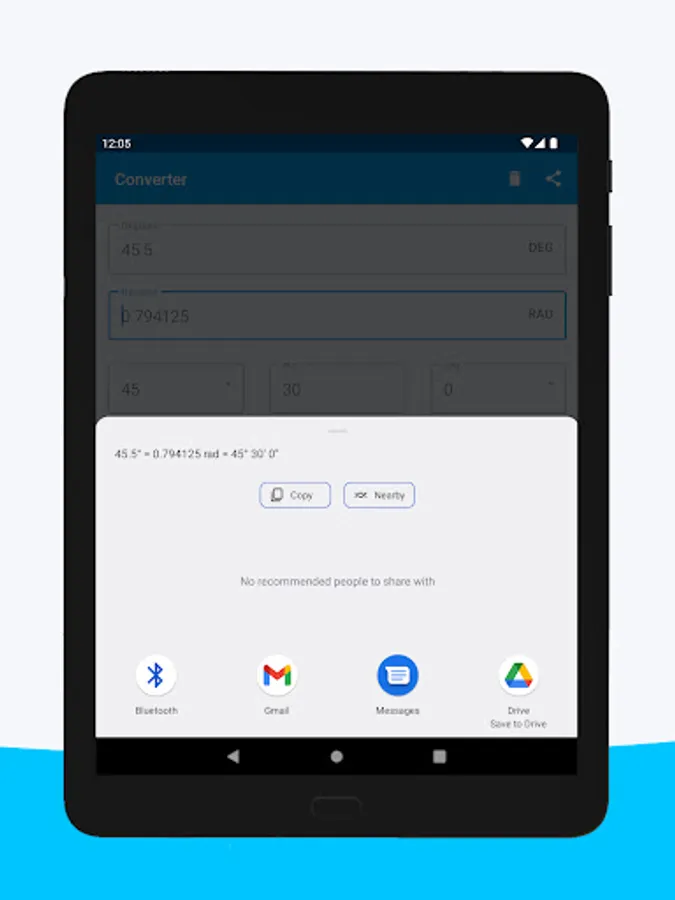 • Performs the conversion of angles in Degrees decimal or sexagesimal (degree, minute and second) to Radians and vice versa.